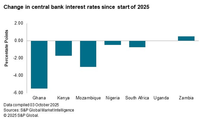 Easing inflationary pressures have enabled central banks across much of the region to lower their interest rates over the course of 2025. Of the seven economies we cover, five have lower levels of interest rates now than at the start of the year. Most notably is Ghana, where the central bank has cut rates by 650 basis points in the past two meetings. Interest rates in Uganda are at the same level as they were at the start of 2025, while only Zambia has posted an increase. Here though, S&P Global Market Intelligence expects a cut of 50-100 basis points at the upcoming November monetary policy committee meeting.