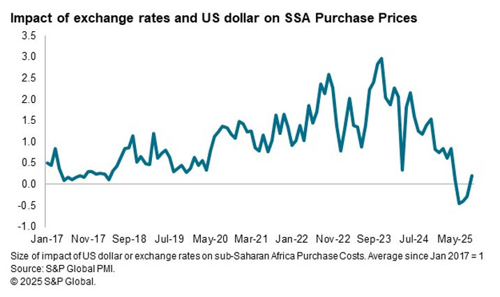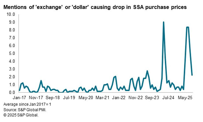 Similarly, recent months have seen above-average mentions of either exchange rates or the dollar causing a drop in purchase prices, to a degree second only to that seen in April 2024, when firms in Kenya were responding to a substantial appreciation of the shilling against the US dollar.