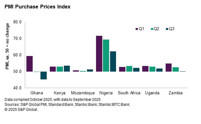 Country level PMI data show that most of the economies we cover in sub-Saharan Africa have seen either a slowdown in inflation of purchase costs or outright falls in prices over the course of 2025. Those countries seeing the strongest currency appreciations against the US dollar – Ghana and Zambia – have recorded periods of decreasing purchase prices. Such price falls are rarely seen among the sub-Saharan Africa PMIs, which normally suffer from marked inflationary pressures. Even Nigeria, where purchase costs continued to rise sharply during the third quarter, posted the weakest pace of inflation since March 2020.