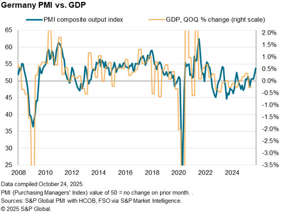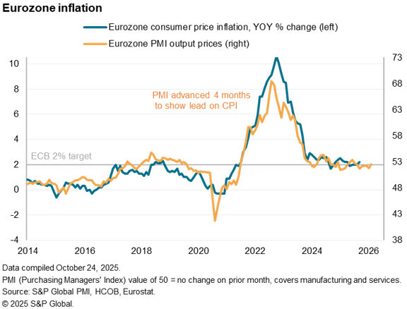 The official eurozone GDP data so far this year has been distorted by volatile growth in Ireland and US tariff shipments, making the underlying trend hard to discern. The strong first quarter GDP gain of 0.6%, around half of which was accounted for by Ireland alone, followed by a meagre second quarter 0.1% expansion. The PMI has instead signalled a steadier but sluggish improvement in the underlying economic growth trend in recent months, albeit with a notably uptick in October.