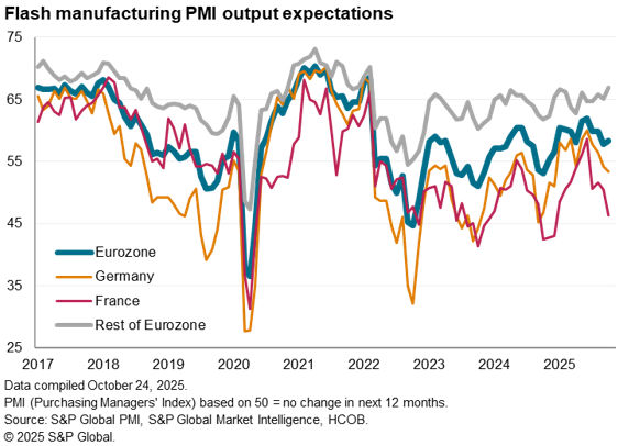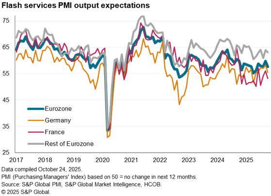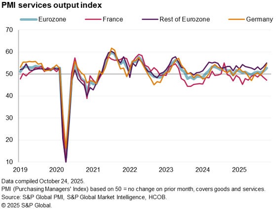 Trends diverged among the eurozone’s two largest economies: whereas output rose robustly in Germany, growing at the fastest rate since May 2023, output fell sharply in France, declining at a pace not seen since February. The rest of the region as a whole meanwhile saw growth accelerate to the fastest since April 2023, further isolating France as a marked underperforming economy in October.