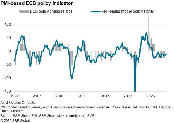 A composite ECB policy indicator based on key PMI gauges suggests an ongoing easing bias to policymaking. Despite the uptick in output growth in October, the expansion remains only modest and was accompanied by only sluggish employment growth as firms remained cautious about expanding capacity. October also saw a slight cooling of input cost pressures, helping keep a lid on selling price inflation.
