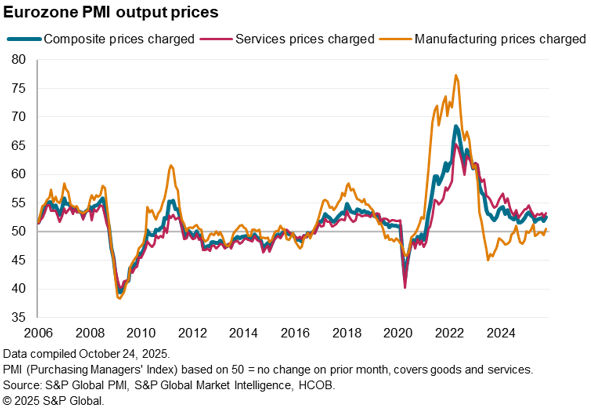 Although selling price inflation ticked higher in October, with the overall rate across goods and services up to its highest since March, the PMI’s price gauge is still broadly consistent with consumer price inflation running at the ECB’s target of 2%.