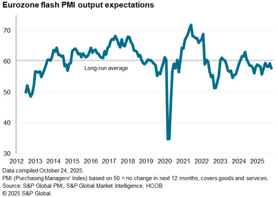 The news on improving current output growth signalled by the eurozone flash PMI was marred, however, by a dip in business expectations about output in the year ahead to a five-month low, taking the gauge of business sentiment further below its long-run average.