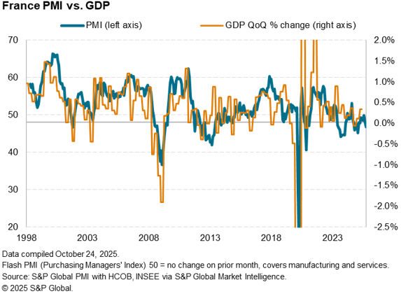 Measured overall, the flash PMI data for Germany are indicative of GDP rising at an approximate 0.5% quarterly pace but the survey data for France point to a quarterly rate of GDP contraction of about 0.1%.