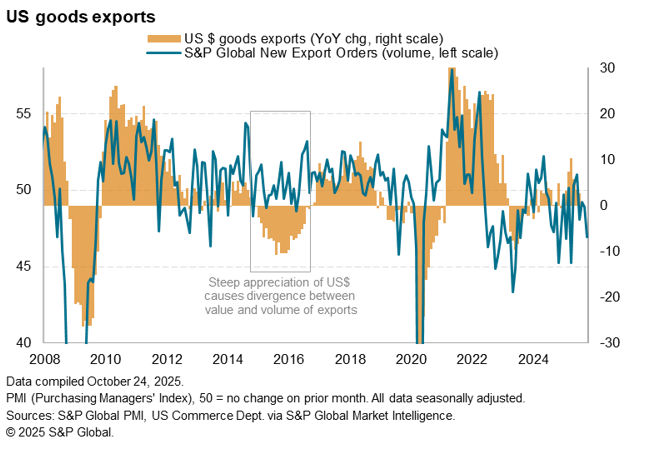 The service sector continued to report especially robust growth, posting the fastest expansion since July and the second-strongest increase so far this year. Inflows of new orders for services likewise improved, rising at the steepest rate seen in 2025 to date. While service providers reported signs of improving domestic demand, albeit subdued in some companies by disruptions caused by the government shutdown, exports of services fell back into decline after modest growth in September.