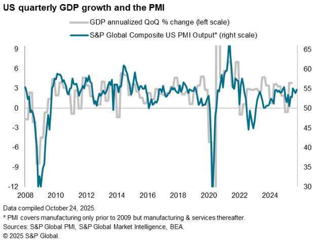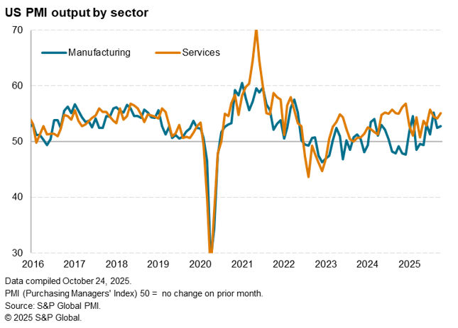October’s flash US PMI data point to sustained strong economic growth at the start of the fourth quarter, with business activity picking up momentum across both manufacturing and services, despite some reports of businesses being adversely impacted by the government shutdown.