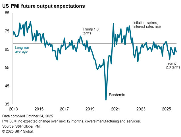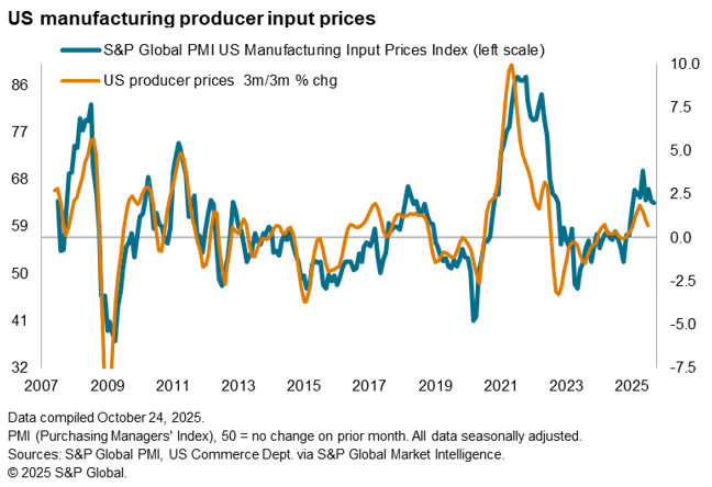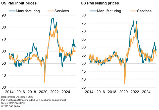 Input cost inflation remained elevated in October, running below the highs seen earlier in the year but picking up slightly since September. Despite being the lowest since February, manufacturing input price inflation remained especially high, once again widely attributed to tariffs.