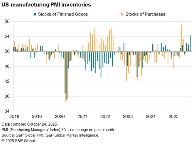 With backlogs of work falling, manufacturers reduced their input buying in October, though some factories continued to accumulate inventories to avoid potential price rises linked to future tariffs. Inventories of purchases rose only marginally as a result, increasing at a much-reduced rate compared to the strong tariff-related stock build of inputs reported earlier in the year.