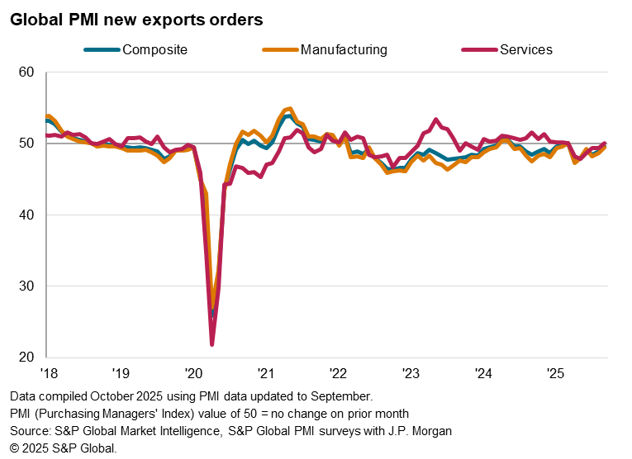 Details from the latest manufacturing PMI data revealed varied performance across countries and regions at the end of the third quarter. Notably, ASEAN as a whole saw goods exports rising for the first time since May 2022, albeit only marginally. This coincided with continued growth in purchasing activity in the US, thereby hinting at further front-loading driven activity especially ahead of additional US sector tariffs. Notably, September’s Global Electronics PMI data pointed to resilient growth in the computing and communications equipment sub-sectors, as the US reportedly mulls tariffs on foreign electronics. Mainland China and South Korea also saw improvements in goods trade performance, with comments from manufacturers attributing better demand to new product launches and reduced trade uncertainty. In contrast, Taiwan, Japan and Australia reported lower new export orders as US tariffs negatively affected overseas demand. Over in the UK and eurozone, subdued trade performance also prevailed, with the former posting the steepest drop in goods exports of all countries tracked by the PMI in September.