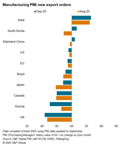 The number of top ten trading economies recording higher goods exports tripled in September from just India in August. India nevertheless retained the lead with the rate of manufacturing new export orders growth accelerating since August, albeit with the overall pace of manufacturing expansion having softened.