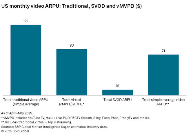 Currently about nine out of every ten US video subscriptions is for a streaming/SVOD app, with traditional pay TV comprising 7% of subscriptions and vMVPD accounting for 4%. Still, traditional generates the most revenue, based on higher average monthly rates compared to SVOD — $122 versus $10.