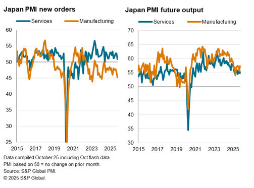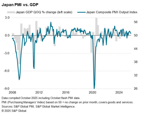 The S&P Global Flash Japan PMI Composite Output Index posted 50.9 in October, down from 51.3 in September. This marked the seventh consecutive month in which the headline reading remained above the 50.0 neutral mark to signal an expansion of business activity. However, the rate of growth decelerated for a second consecutive month to the slowest since May.