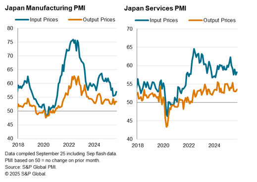 Although Japanese companies across both the manufacturing and service sectors faced higher cost pressures, only the latter group seeing greater success in passing on cost increases to their clients, with goods prices again constrained by weak demand.