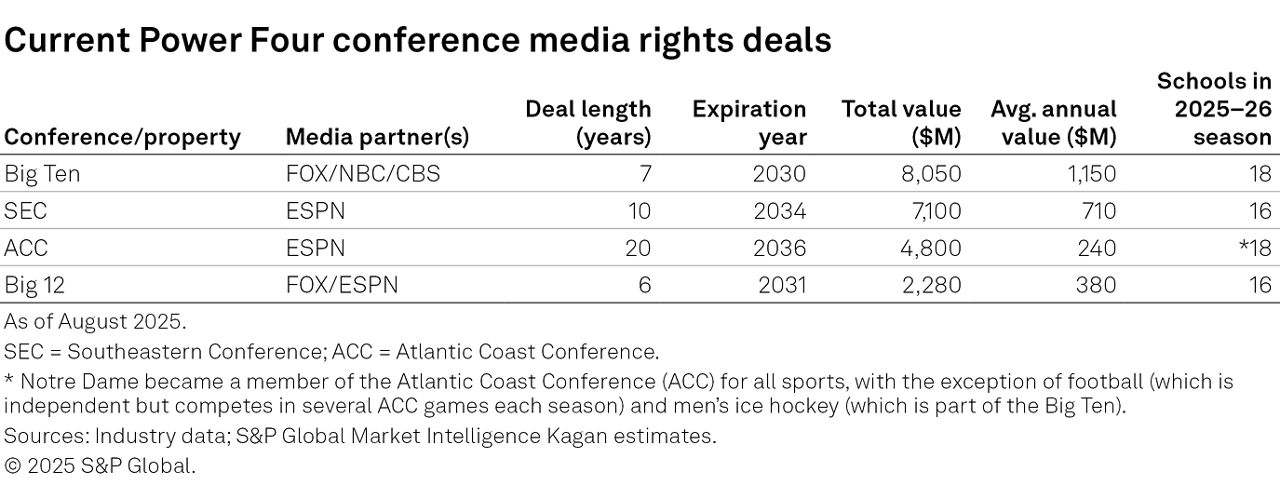 Big Ten: Now in its third year, the Big Ten's media rights agreement with FOX (US), Paramount and NBC (US) is valued at over $8 billion for seven years and continues to stand as the largest media rights deal in college conference history. Previously, the six-year contract with Fox, ESPN (US) and CBS (US) was worth $440 million annually, while the current deal is valued at an estimated $1.15 billion per year. The conference begins its second year with 18 teams following the transition of Oregon, UCLA, USC and Washington from the previous version of the Pac-12.