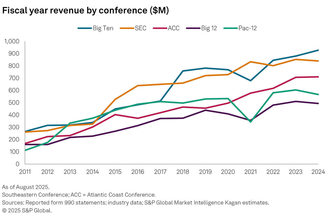 While the Power Four conferences collectively surpassed $3.5 billion in revenue, slight declines were noted in the SEC, Big 12, and Pac-12 for the 2024 fiscal year. The Big Ten led with $928 million in total revenue, while the SEC reported $840 million. The ACC's revenue remained stable at $711 million, and the Big 12 earned $494 million.