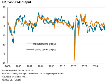 UK business activity growth picked up in October from the near-stalled picture seen in September but remained disappointingly sluggish. At 51.1, up from 50.1 in September, the flash PMI headline composite output index was the second-lowest seen over the past five months and hence signalled only a modest expansion of the economy at the start of the fourth quarter. The PMI is broadly consistent with GDP having stalled in September and growing at a 0.1% quarterly pace in October.