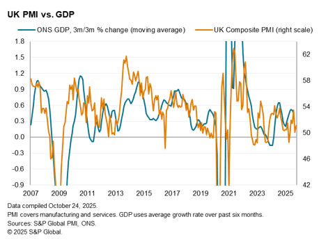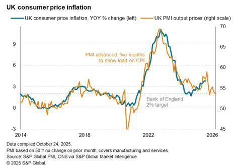 Since August 2024, the Bank of England has reduced its Bank Rate five times, which now stands at a two-year low of 4.00%. Recent policy meetings have seen split decisions, however, reflecting concerns over stubborn inflation on one hand and signs of weak economic growth and falling employment on the other. In signaling sluggish economic growth, falling employment and moderating price pressures, the flash PMI data for October will therefore play into the hands of the doves and could shift policymakers increasingly toward cutting interest rates again before the end of the year.