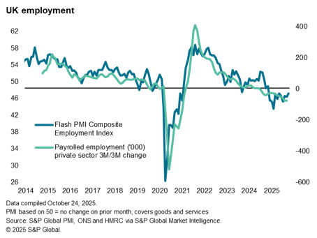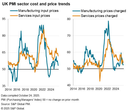The sluggish output growth signalled by the PMI was accompanied by a drop in employment for the thirteenth straight month – a labour market contraction which was triggered by last year’s Autumn Budget, which raised staffing costs to businesses. However, October’s drop in employment was the smallest signalled by the PMI since May, reflecting reports of reduced headcount-trimming by companies amid signs of improved demand and fewer cost concerns following prior employment cuts.