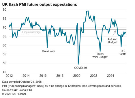 Looking ahead, business optimism about the next 12 months remained below its long-run average to point to subdued sentiment by historical standards. Companies largely cited concerns over weak economic prospects for the year ahead, in part linked to government policies and broader global economic and policy uncertainty. Companies also raised concerns over the potential for further growth dampening policies in the upcoming November Budget. However, confidence lifted a little higher compared to September, to now run at the second highest recorded since last year’s Autumn Budget, reflecting signs of pessimism moderating in both manufacturing and services economies compared to earlier in the year.
