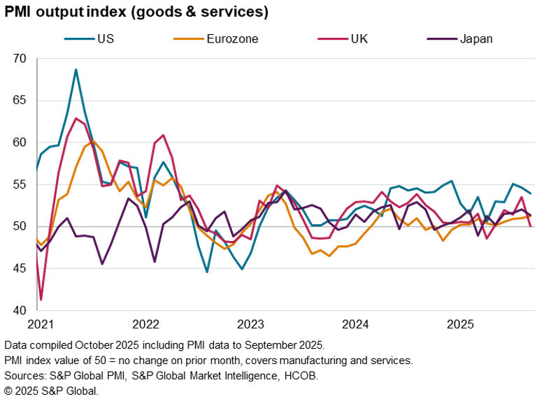 In the absence of official economic data releases, October’s flash PMI data will be eagerly assessed for indications of whether the US has sustained its lead among the major developed economies after growth slowed for a second month in September. We have raised concerns over the sustainability of the US upturn given signs of a fading boost from tariff front-running and a growth dependency on financial services and tech, but October’s data could be buoyed by the FOMC’s first cut to interest rates seen this year and widespread expectations of more rate cuts to come.