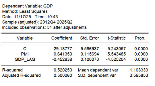 To estimate PMI-implied GDP growth rates, we can build a simple OLS regression model where: