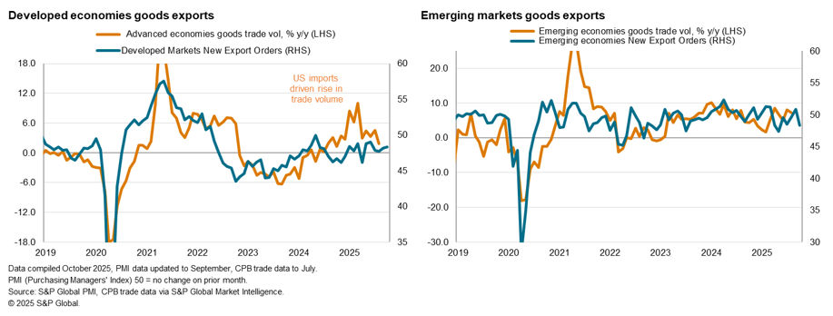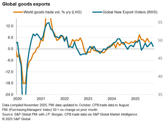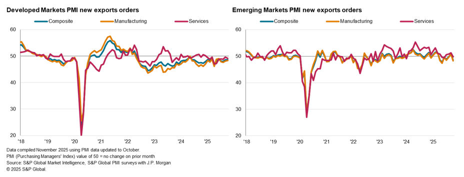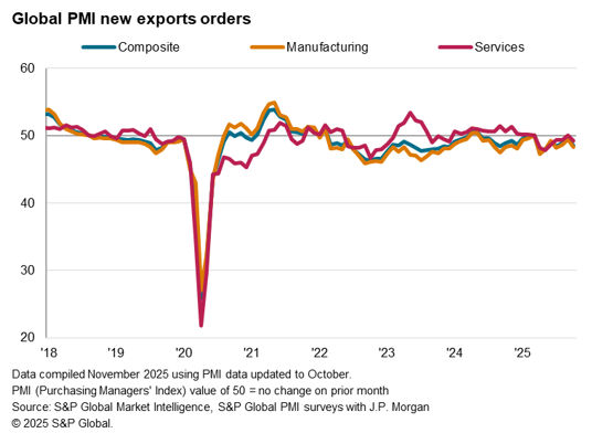 The worldwide Purchasing Managers’ Index (PMI) surveys compiled by S&P Global Market Intelligence indicated that global trade further contracted at the start of the final quarter of 2025. Moreover, the degree of decline deepened. The seasonally adjusted Global PMI New Export Orders Index, sponsored by J.P.Morgan and compiled by S&P Global, fell to 48.5 in October from 49.7 in September. The latest reading marked an extension of the period of trade contraction that commenced in April.