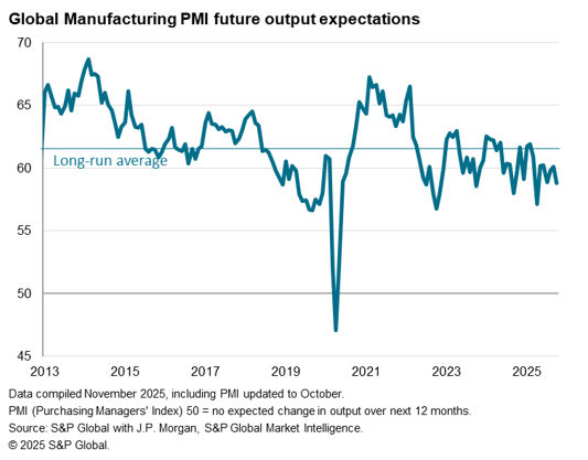 The downturn in manufacturing exports took place against a backdrop of sustained growth in the goods producing sector. The global manufacturing sector saw another modest expansion in production, driven primarily by rising domestic demand. In cases such as the US, the latest rise in output was also seen attributed to inventory building, with notable risks of fading momentum in the coming months. Overall, the goods trade climate remained subdued, with potential weakness also reinforced by a loss of confidence among goods producers in October. Optimism regarding output in the year ahead sank to the lowest since April, when widespread US tariffs were first announced. Among the economies tracked with the lowest future output expectations measured against its long-run averages were Canada and mainland China, both having seen worrisome headlines regarding trade with the US in October. Concerns over trade relations with the US have also affected the neighbouring economies of mainland China and Canada. For instance, various North Asian economies also saw lower output expectation indices compared with their long-run as jitters over the outlook for US-China trade dampened sentiment for manufacturers. While some of these concerns are likely to ease into the end of the year as a trade truce was achieved at the end of October, the notable drop in confidence continued to paint a subdued picture for the manufacturing sector.