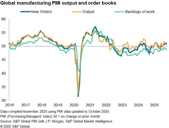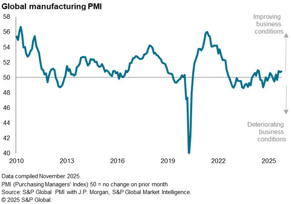 The Global Manufacturing PMI, sponsored by J.P. Morgan and compiled by S&P Global Market Intelligence, registered 50.8 in October from 50.7 in September. Although signalling only a very modest improvement in manufacturing conditions, the past three months have seen the PMI at its highest average for just over three years.