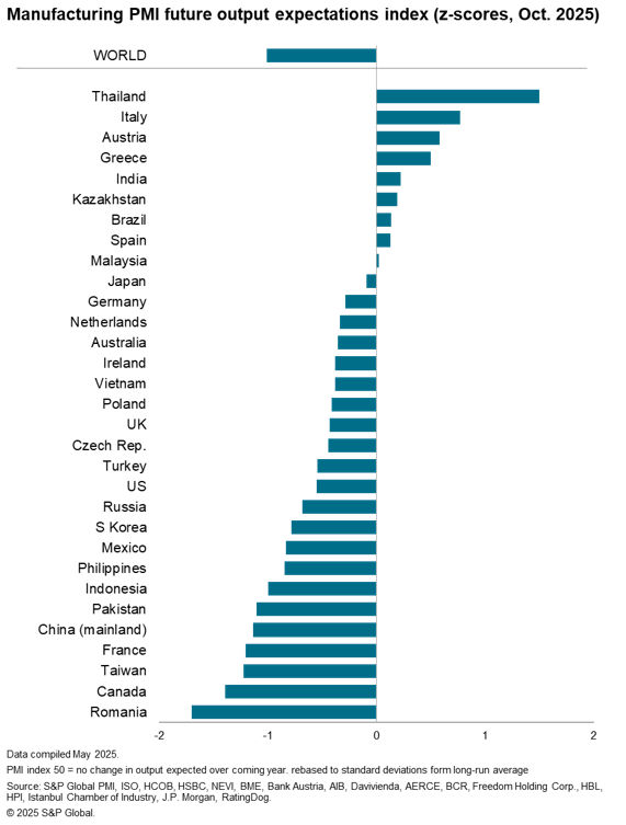 Relative to long-run averages, manufacturers are most upbeat about the year ahead in Thailand, Italy, Austria and Greece, but are gloomiest in Romania, Canada, Taiwan and France.