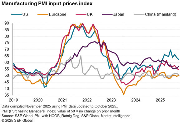 While overall global inflationary pressures remained benign, there were observable differences among the major economies, with the US notably once again reporting elevated input cost inflation. Only Mexico and Indonesia reported higher input cost inflation than the US. Companies in the US commonly attributed higher costs to the impact of tariffs. In contrast, input prices fell in mainland China, rose only marginally in the eurozone and increased at only modest rates in Japan and the UK.