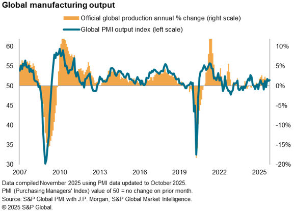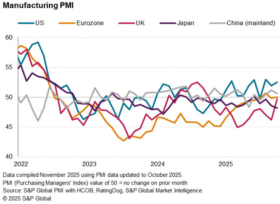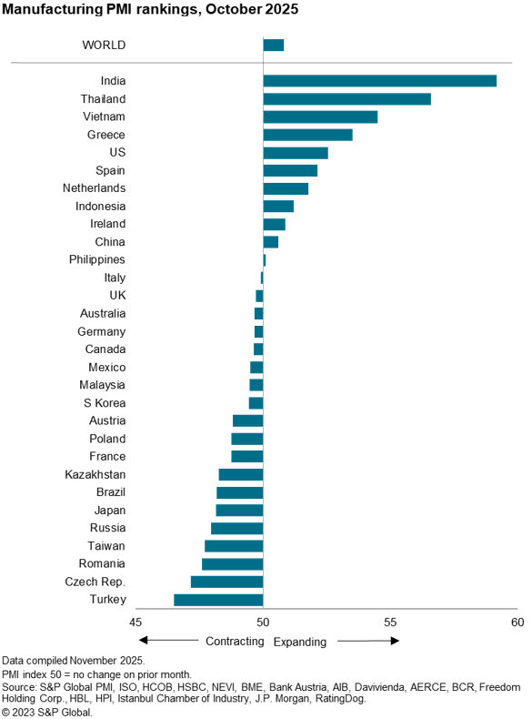 Global manufacturing growth was again led by India, but October also saw increasingly strong performances in both Thailand and Vietnam as producers in these economies reporting a thawing of concerns over the impact of US tariffs. Thailand’s PMI was the highest since May 2023 while Vietnam’s PMI hit the highest since July 2024.