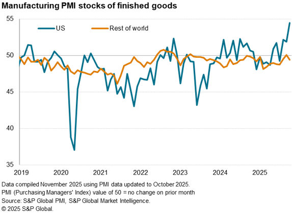 The US also reported another above-average PMI reading in October, and has now led the major economies in terms of manufacturing performance over the year to date. That said, the survey showed US production being buoyed by inventory building (the month saw an unprecedented rise in unsold stock), which suggests US growth could fade in the coming months. In contrast, inventories of finished goods fell in the rest of the world.
