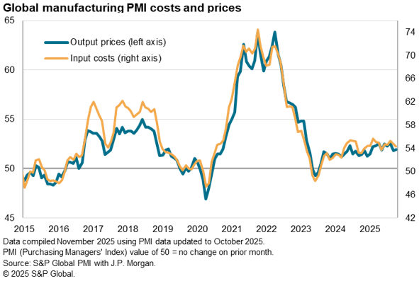 In terms of pricing, global manufacturing inflationary pressures remained subdued in October. Although both input costs and average factory gate selling prices rose, rates of increase were broadly in line with the muted averages recorded over the past two years.