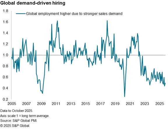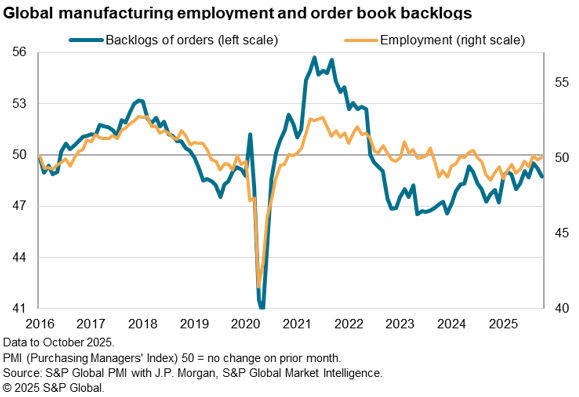 The lack of future output optimism and falling order book backlogs also led to further lack of hiring. Despite the overall rise in global production and new order inflows in October, employment was unchanged during the month as firms typically focused on productivity gains rather than the expansion of capacity.