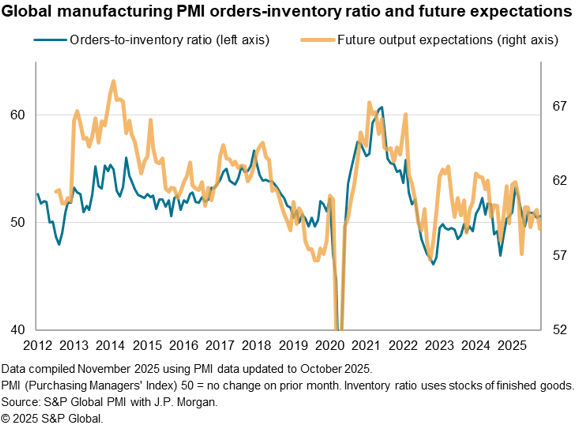 The depletion of order book backlogs, plus concerns over the economic environment, contributed to increased global pessimism in October. Future output expectations fell worldwide to their lowest since April, when US tariff announcements had clouded the outlook. Expectations are now among the lowest recorded over the past three years.