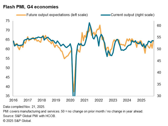 Economic growth showed encouraging resilience across the four major developed economies as a whole in November, according to S&P Global’s flash PMI surveys. Growth across the G4 was the joint-highest seen over the past two-and-a-half years. Business activity growth accelerated in the US and Japan and remained solid in the eurozone. The UK bucked the trend, however, being the only G4 economy to report a disappointing combination of markedly slower growth and falling employment.