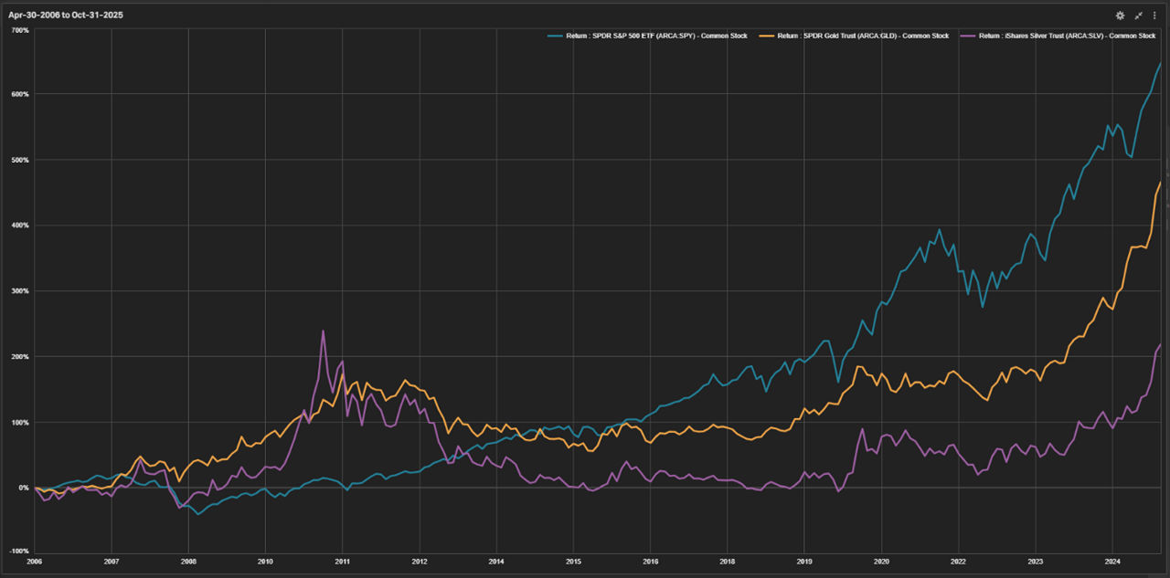 After the early-2010s surge in metals, the cycle turned. As real yields climbed and the dollar strengthened, gold cooled off and silver corrected more sharply. Equities, meanwhile, kept moving higher.