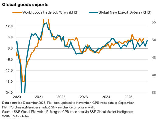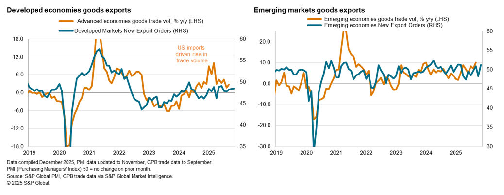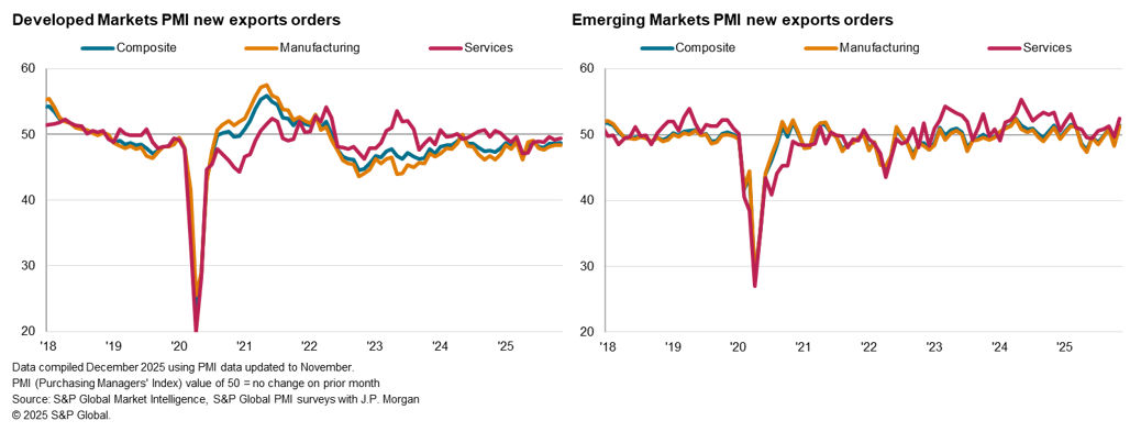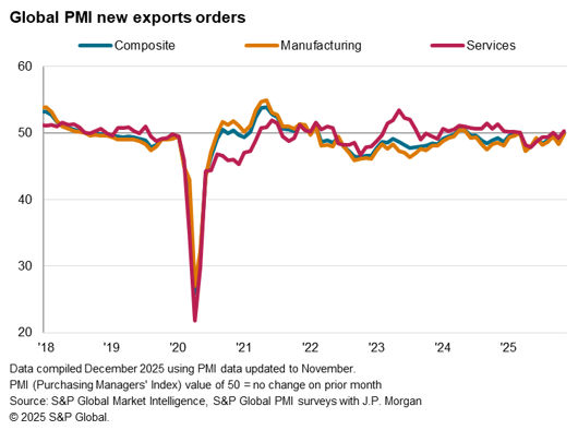 Excluding mainland China, global goods exports shrank at a slightly sharper pace compared to October. This was set against a backdrop of slowing manufacturing demand and production growth in November. Overall new orders rose globally at only a marginal rate that was the softest in the current four-month sequence of expansion. This reflected a further fading of demand strength following rounds of front-loading of goods orders ahead of US tariffs earlier in the year. Global purchasing and hiring activities also declined among goods producers, coinciding with a renewed depletion of both pre- and post-production inventories.