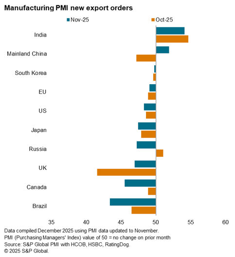 On the other hand, Brazil and Canada recorded the steepest downturns in goods trade midway through the fourth quarter. In Brazil, the pace at which external orders fell was the sharpest since June, with tariffs impact being especially widely reported upon orders from the US. Likewise for Canadian manufacturers, tariffs reportedly dampened new export orders from the US resulting in a tenth successive monthly reduction in overall export orders.