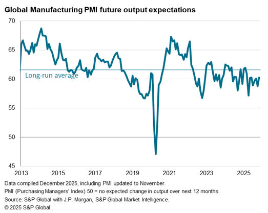 Despite softening demand growth and trade activity outside of mainland China, business sentiment notably improved globally among manufacturers midway through the final quarter of 2025. Optimism about output in the next 12 months rose to the highest level since June. Unlike the recovery in exports, the latest uplift in confidence was relatively broad-based as optimism levels rose not only in mainland China but also touched a five-month high in the rest of the World, thereby hinting at the likelihood for better global manufacturing sector conditions in the coming year.