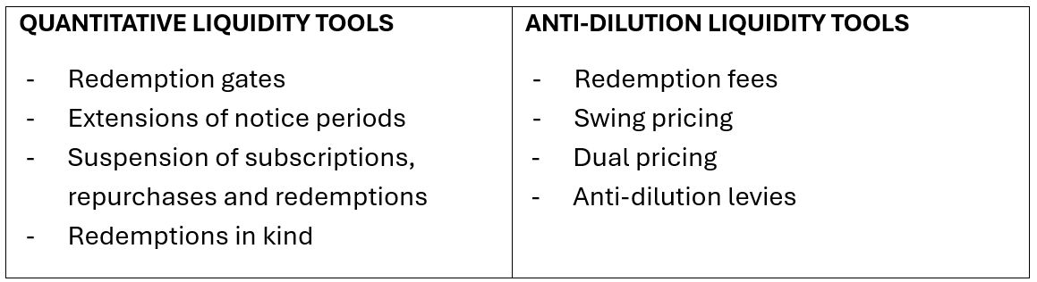 To ensure fairness among investors and prevent excessive redemptions in both normal and stressed market conditions, the ESMA has proposed the implementation of at least one quantitative tool and one anti-dilution tool. By April 2026, fund managers in the European Union will be required to implement at least two mitigants from the following list:*