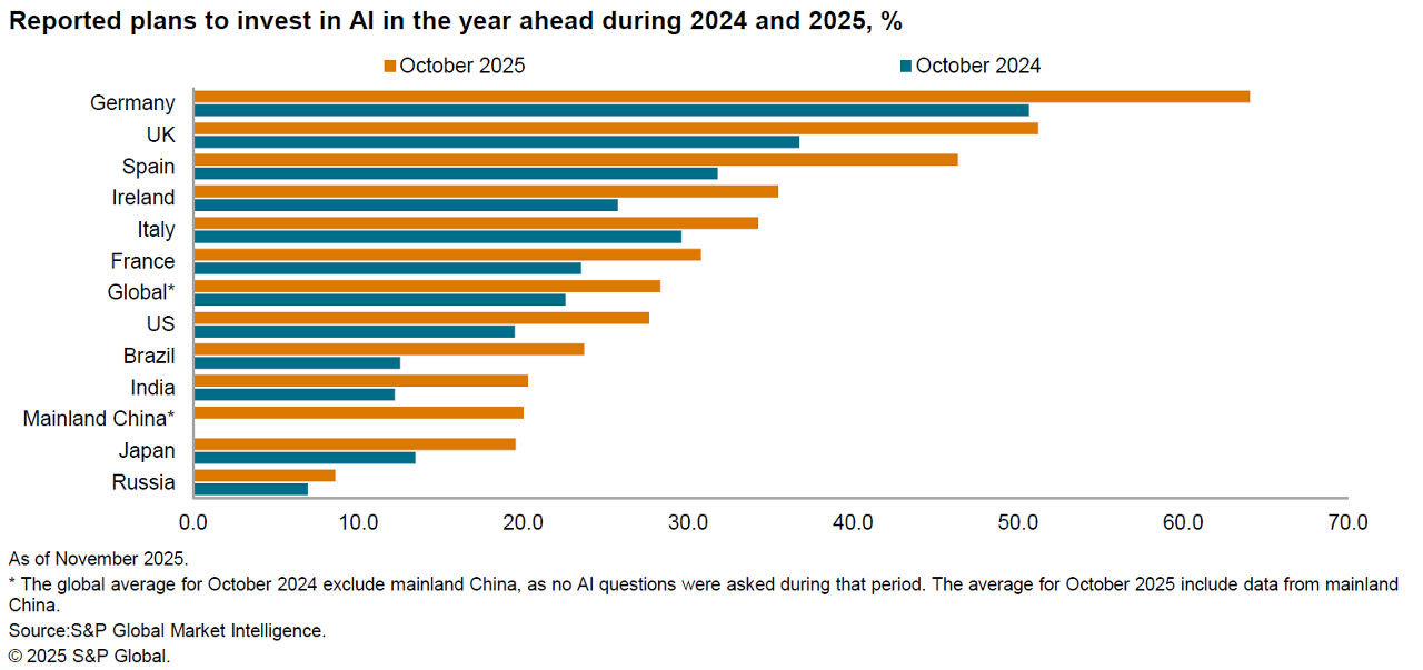 The latest PMI® survey on AI investment reveals an upward trend in the adoption of artificial intelligence across various sectors and countries, as businesses recognize the transformative potential of AI technologies in enhancing operational efficiency and driving innovation. Following our inaugural survey in 2024, this year’s findings indicate that the proportion of firms investing in AI has risen across all monitored nations and sectors, with many companies expressing intentions to further increase their investments in 2026.