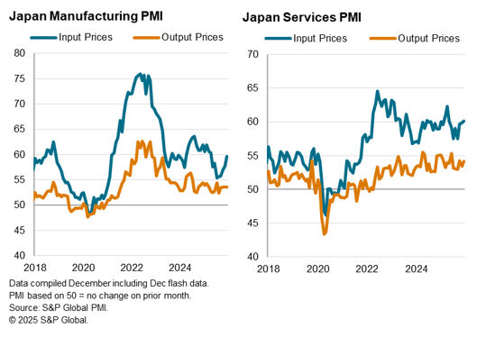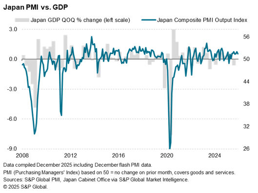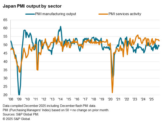 Business activity in Japan continued to grow in the final month of 2025, according to the flash PMI data by S&P Global. While the rate of output growth decelerated from November, fresh increases in new and backlogged orders pointed to the likelihood for business activity growth to be sustained into the new year. This brighter picture was further reinforced by the quickest rise in headcounts in just over one-and-a-half years and still-elevated confidence regarding future output.