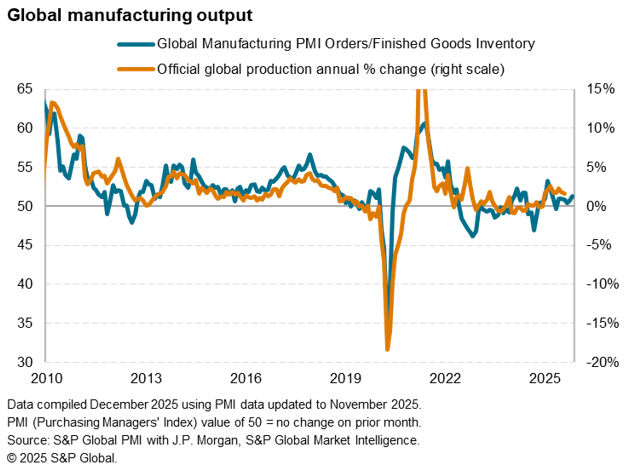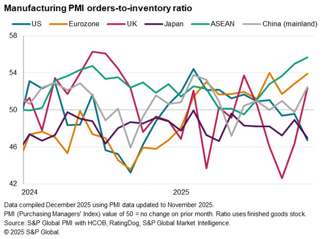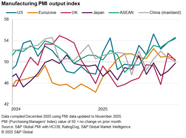 Worldwide manufacturing business conditions improved in November but at a reduced and only very modest rate. Growth rates varied by region, with the US and ASEAN economies notably outperforming as both reported especially strong and accelerating expansions. However, trends in order book and inventory levels hint at these performances diverging in the coming months, linked in part to US tariff policy.