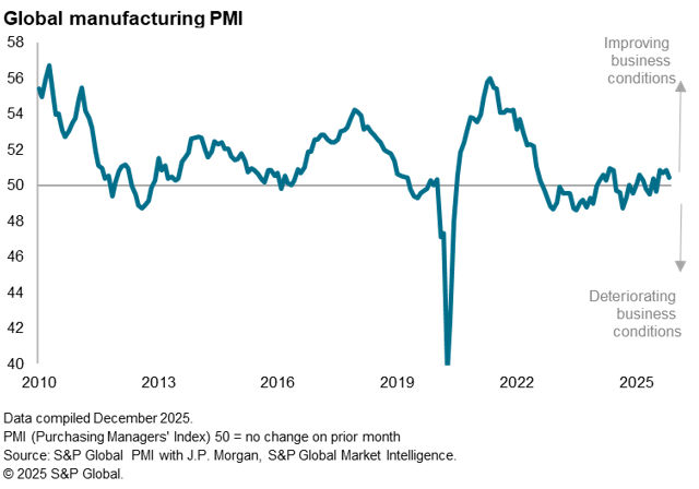 The Global Manufacturing PMI, sponsored by J.P. Morgan and compiled by S&P Global Market Intelligence, fell from 50.9 in October to 50.5 in November. The latest reading signalling only a very modest improvement in manufacturing conditions, and the weakest increase since the PMI rose back above 50.0 in August.