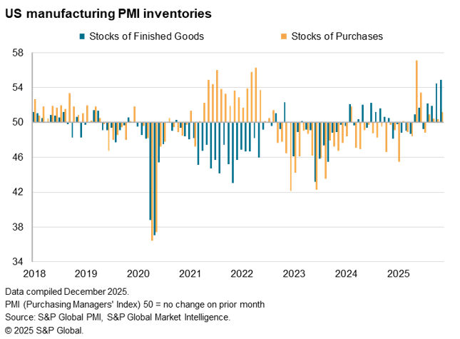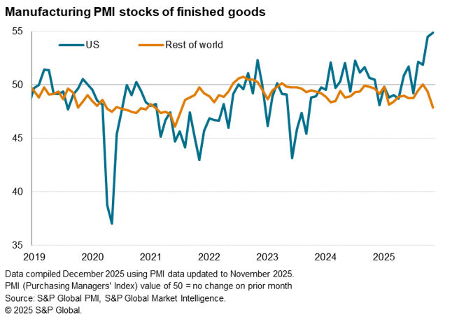 A key difference between the US and elsewhere is that US companies report that factories have been using up inputs bought ahead of potential tariff-related price rises, as reflected by a sharp rise in inventories of inputs in the second quarter of the year. However, the additional output created from these inputs in the second half of the year has not always been sold, resulting in the accumulation of in finished goods inventory.