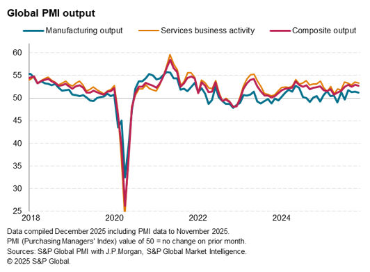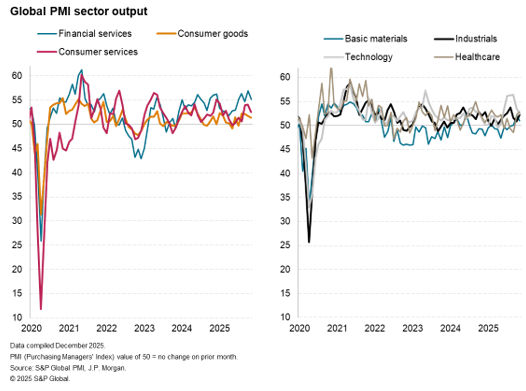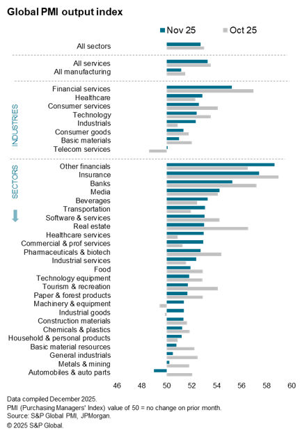 Global economic growth remained robust in November, according to PMI survey data, though growth was heavily reliant on a further strong expansion of financial services activity, in turn linked to supportive global financial conditions. In contrast, many other sectors remained mired in only modest or slowing growth, though notably only one sector – autos – reported falling output.