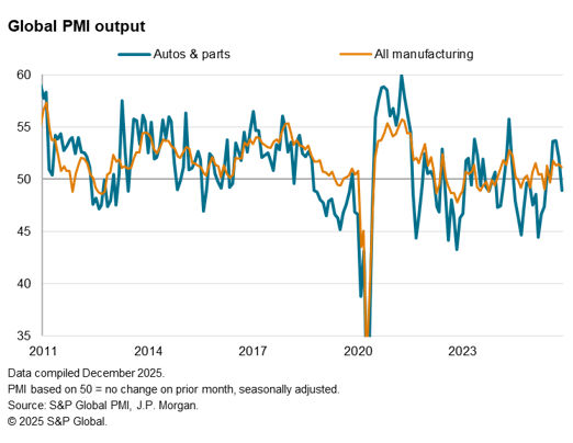 The worst performer, and in fact the only sector reporting a fall in output in November, was automobiles and auto parts. November’s fall in auto sector output was the first in six months, and was blamed in part on the fading impact of US tariff policies. Demand for vehicles had been buoyed over the summer as buyers sought to beat potential tariff price rises. November’s decline therefore represents something of a return to the pre-tariff trend of falling production globally.