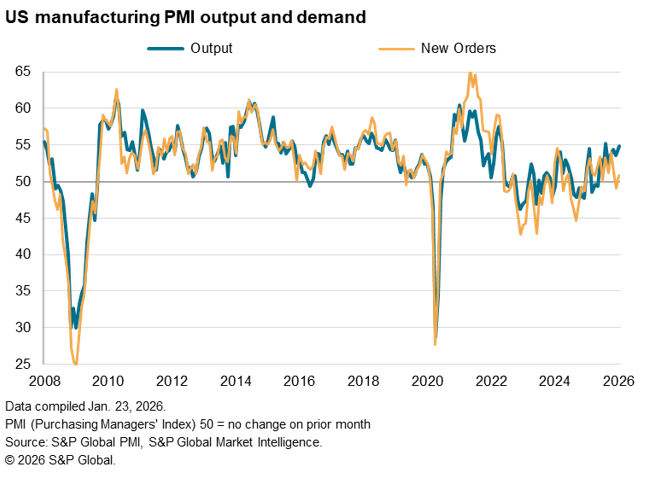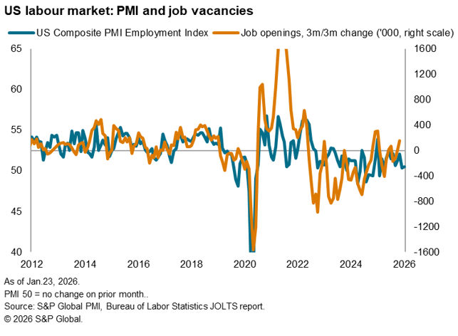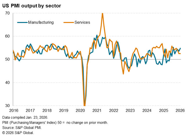 The headline S&P Global US PMI® Composite Output Index signalled ongoing growth of business activity at the start of 2026. Output has now grown continually for exactly three years. However, at 52.8, up fractionally from 52.7 in December, the 'flash' reading (based on about 85% of usual survey responses) signalled only a marginal improvement in growth from December’s eight-month low.
